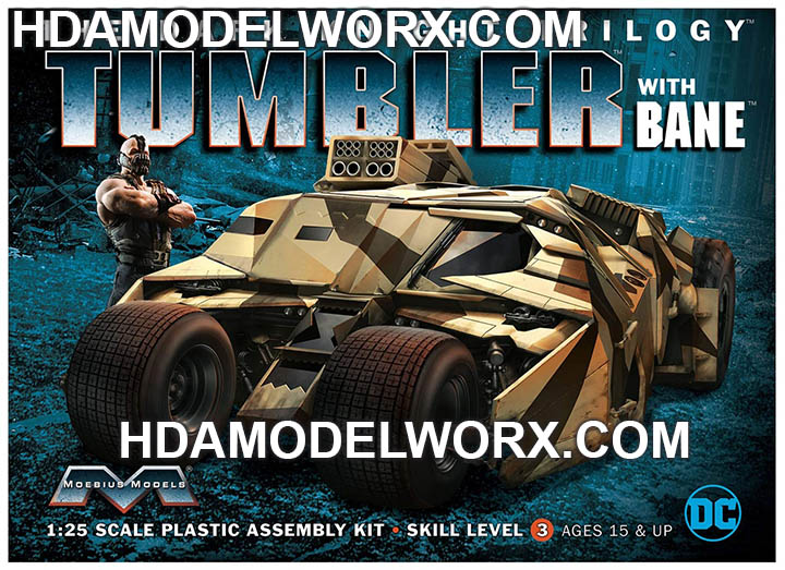 Moebius 967 1/25 scale Batman The Dark Knight Trilogy: Batmobile Tumbler w/Bane Figure. This kit includes parts for the assembly of one plastic model kit. The set requires both glue and paint in order to be completed. Paints and glue are not included. For modelers aged 15 and older