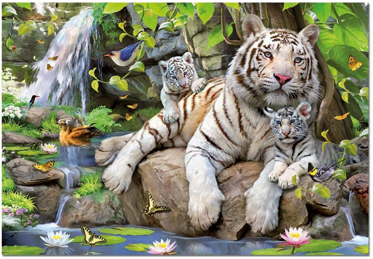 Puzzle of 1000 pieces representing a Bengal Tiger mum and her 2 cubs.