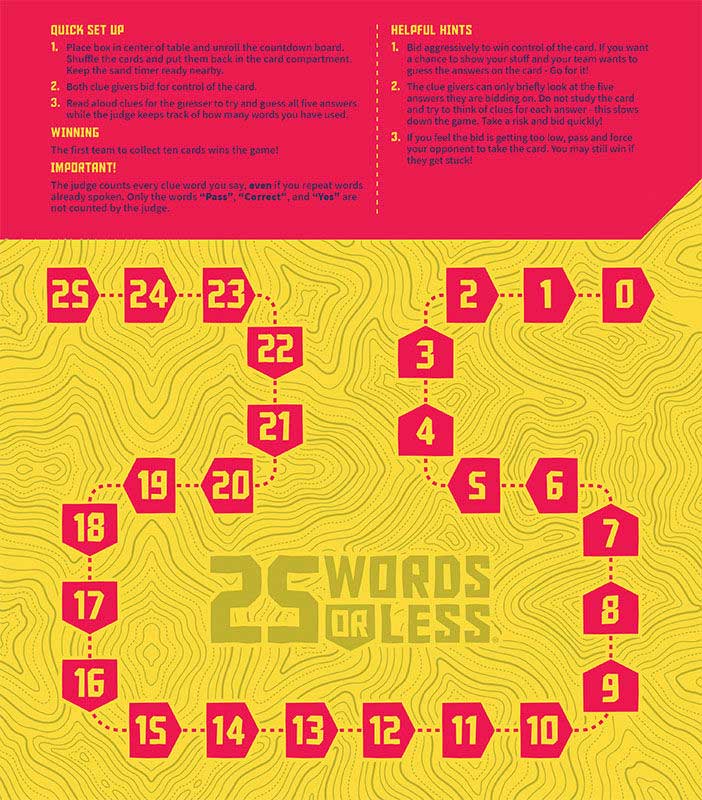 In this fast-paced party game, two clue-givers bet on how few words they’ll need to have their teammate(s) guess five secret answers, starting at 25. The lowest bidder takes the card and must beat the challenge within their limited clues--and time! Every word counts in this energy-fueled board game that keeps family and friends on the edge of their seats!