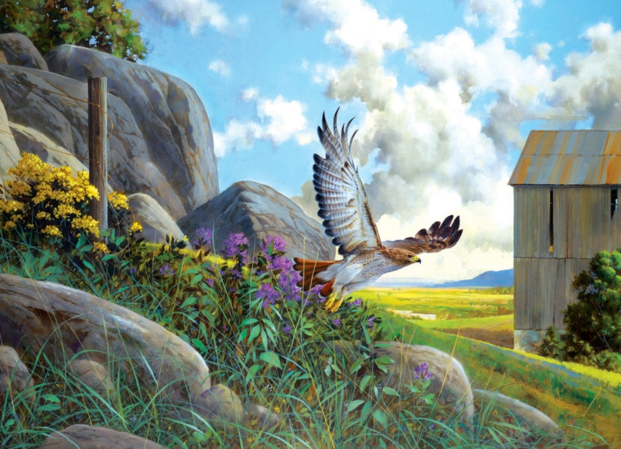 Take Off is a 500 piece puzzle featuring a falcon in flight among the rocky hill. An old barn and green pastureland are the backdrop for this cheery bird puzzle.