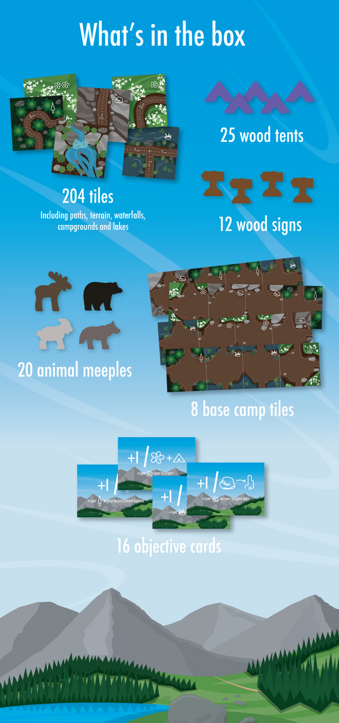 Players will simultaneously draw 2 random tiles and place them into their parks. Players will earn points by creating a long out-n-back trail, large areas of contiguous habitats, surrounding waterfalls, reaching lakes, making space for wildlife, and placing campsites.