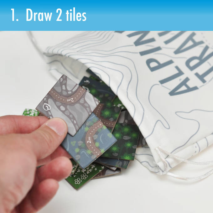Alpine Trails is played in rounds in which all players play at the same time. Everyone draws two tiles from the bag at random. Both tiles will need to be placed somewhere on each player's individual map. - Choose trail or terrain
