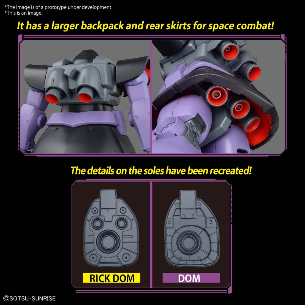 The armor and internal structures of MG 1/100 RICK DOM have been upgraded. Body structures such as the soles and backpack have been renewed, and the bluish-purple parts colors on the body of MG 1/100 DOM have been changed to recreate the Rick Dom’s refined color scheme.