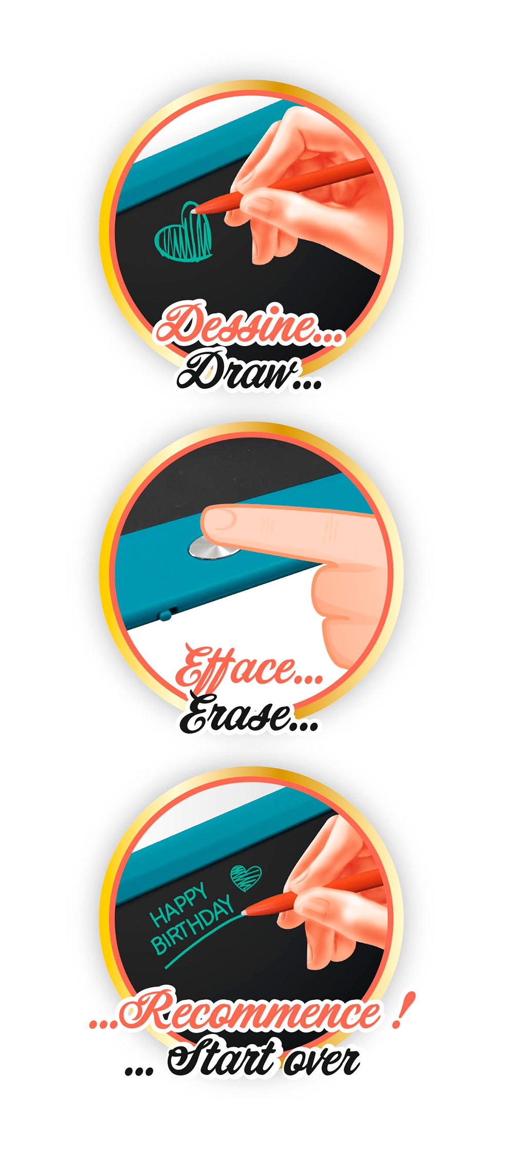 Write, draw or take notes on the large format drawing tablet with LCD screen. Write using the stylus like a pen. Erase by simply pressing the button!