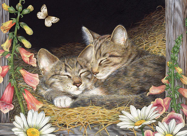 Adorable kittens have a Morning Snooze in the barn. A tray puzzle is durable inlaid pieces in a tray with definitive outlines underneath to help identify where each piece goes. The large pieces makes it easy for hands to grasp and allows for those needing more visual cues to see a greater portion of the image per piece. Recommended for ages 3+.