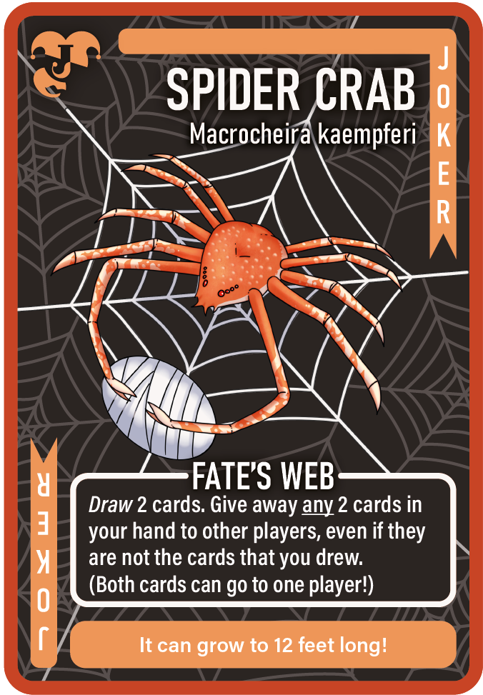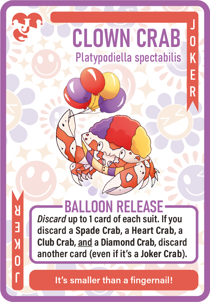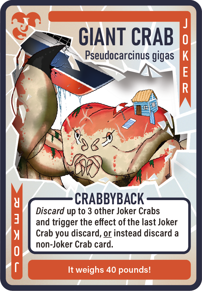 Joker Crabs, which are all based on real crab species, have unique effects. All but one of them can benefit a player by, for instance, forcing an opponent to draw from their hand or allowing them to play unique combos. The final Joker Crab — the Lobster — is a barrier to victory as it cannot be played; should you hold the Lobster, you must find a creative way of discarding it without playing it.