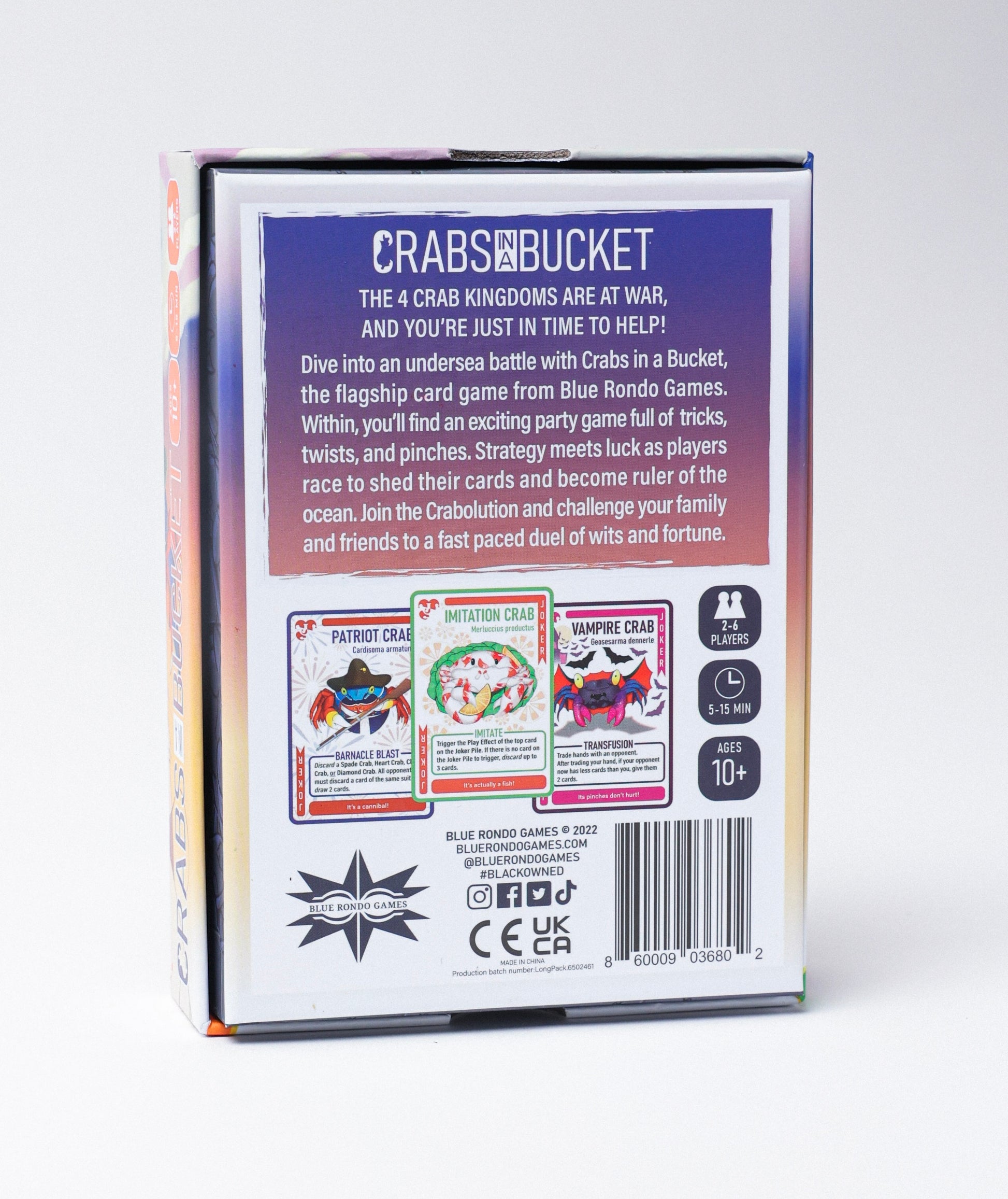 Crabs in a Bucket is a fast-paced shedding type card game for 2-6 players that blends luck, strategy, and a cast of colorful crab characters. The goal of the game is to be the first player to play or discard their entire hand.