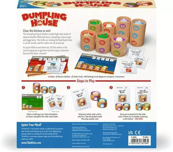 Order up! Introducing ThinkFun's Dumpling House! Dumpling House will take your love of brain food and mix it with your love of brain games. Pick the challenge to stack the baskets. Grab the orders and figure out which baskets go out first. The logic game of de-stacking orders, the game is perfect for the logic lover who also loves dumplings! With 40 progressive challenges, Dumpling House will offer hours of brain-boosting fun! Sharpen those logic skills, hone that critical thinking, and satisfy your mind's hunger with Dumpling House!