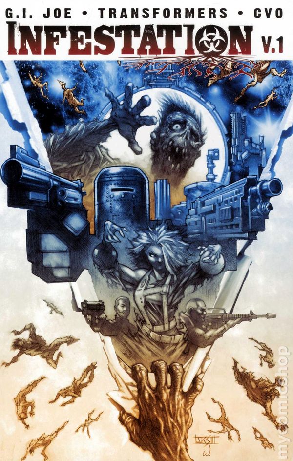 Written by Dan Abnett, Andy Lanning, and Mike Raicht. Art by David Messina, Nick Roche, and Giovanni Timpano. Cover by John K. Snyder III. It begins here! The first-ever IDW event! Something goes horribly awry in the IDW universe: a dimensions-spanning zombie outbreak of epic proportions, which threatens to tear many of IDW's biggest realities asunder! Then, the infestation moves to the TRANSFORMERS universe, where buildings are falling, and the dead are rising! When Big-Bad GALVATRON crash lands on Earth, something ain't right. It's up to our 'Bots-in-blue to run to the rescue or... well... EVERYONE to fight off not just Galvatron, but the zombie horde spreading through Las Vegas! Next, the disease spreads to the G.I. JOE universe, when a robotic arm of unknown origin has been discovered and both the JOEs and COBRA race to discover its secrets. Little do the two sides know that the arm has its own agenda -- assimilating the world's military technology into the Infestation fold! A secret underwater COBRA base full of B.A.T.S. sounds like the perfect place to start! Softcover, 132 pages, full color.