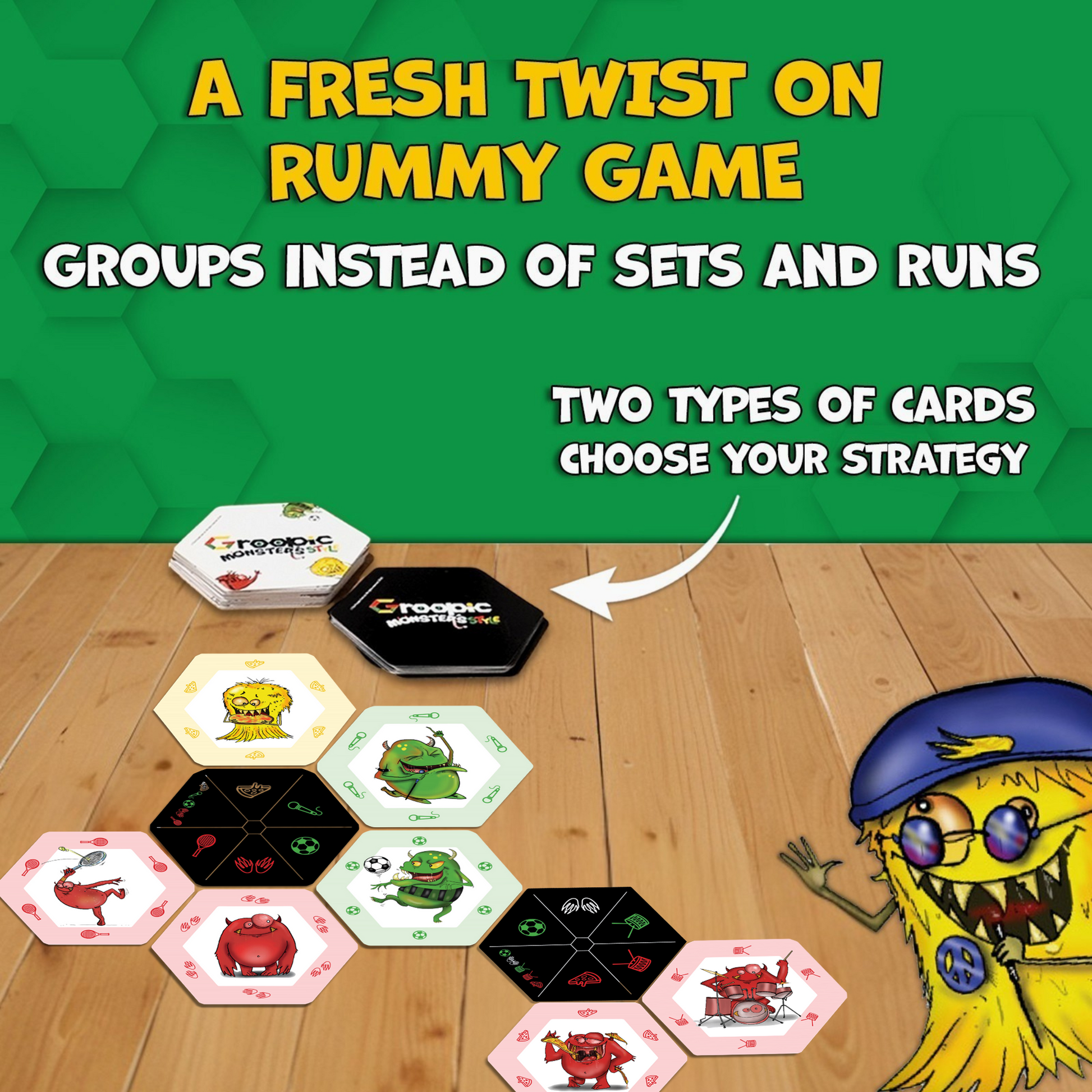 Instead of sets and runs, players collect groups of hexagonal Monster Cards around central Groopic Cards depicting monster activity symbols.