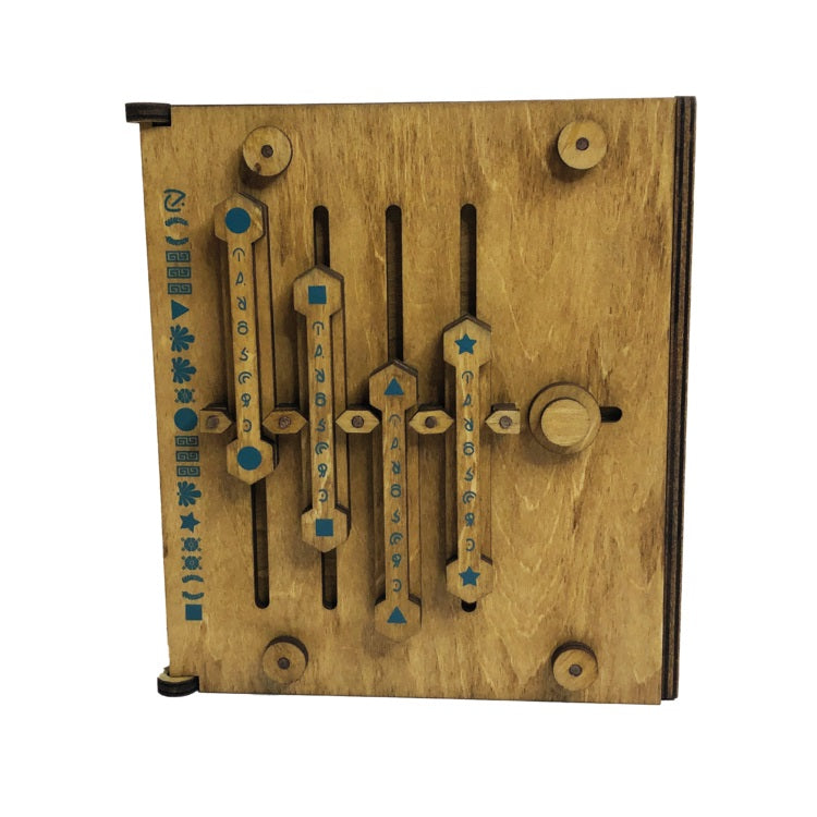 This puzzle box is inspired by the book-binding technology developed by the Ancient Romans during the reign of Caesar. Finding the correct position for the sliders requires you to solve the puzzle of the mysterious symbols painted all over the box.