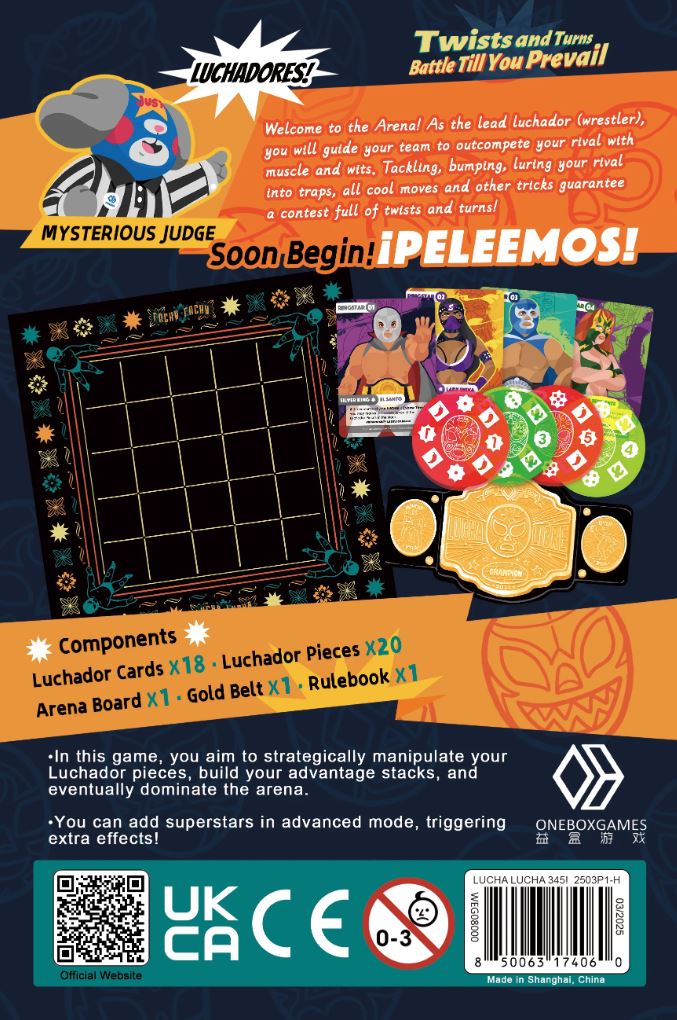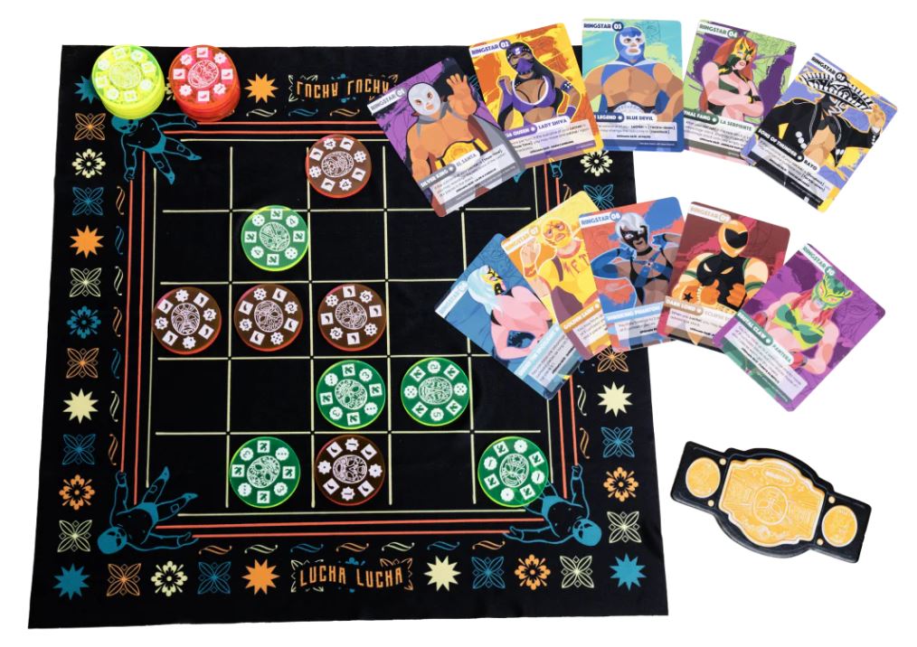 As you embark on this game, players take turns to move their Luchador pieces to Lucha! and try to form as many of their advantage stacks as possible. After moving one of the advantage stacks through several empty spaces until it Lucha, the moved stack will stack onto an opponent's advantage stack and resolve the outcome. The game ends when neither of the players can Lucha! anymore. Then calculate how many cheers each player has received; whoever receives the most cheers wins the game and the Gold Belt!