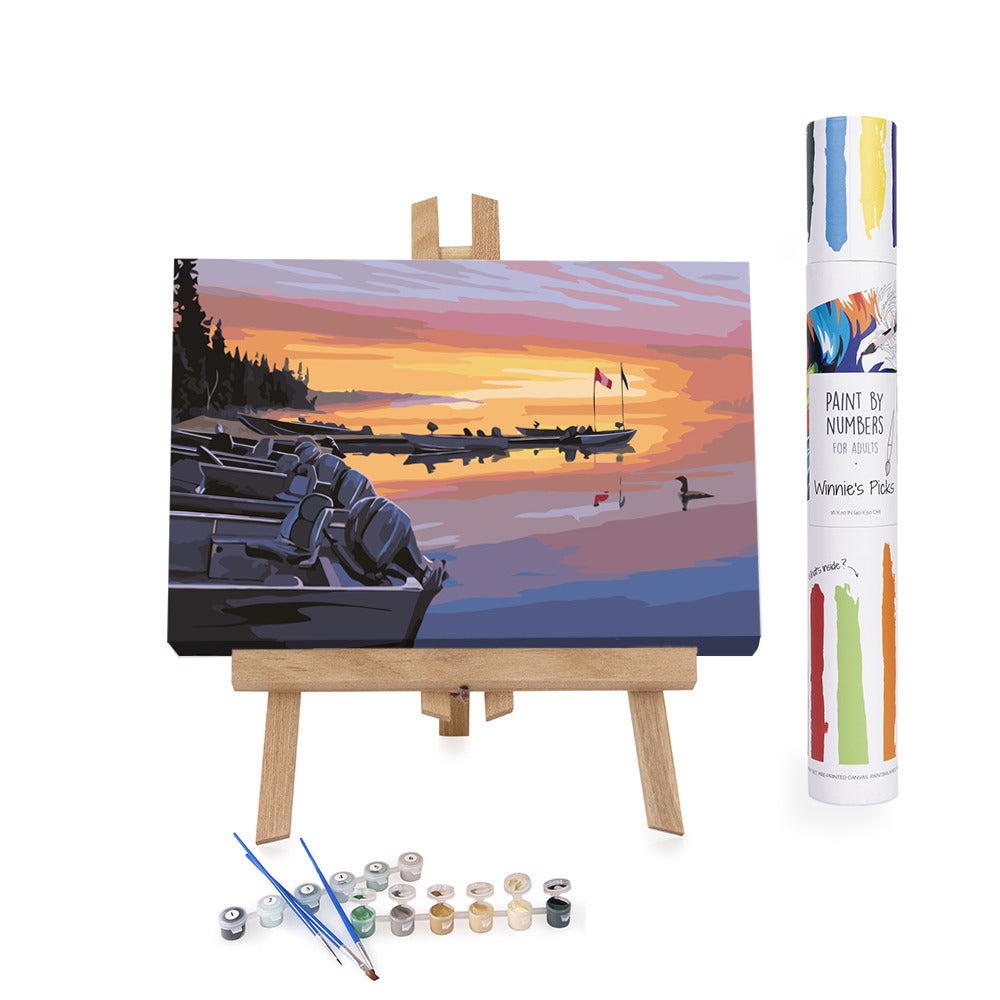 Manotak Lodge by Anthony J Padgett is a paint by numbers of a ship inspired by a beautiful sunset where different tones of gold and pink interact to create a warm evening. The sun is setting to let the night takes over, the boats are all docked along the pier, while the ducks enjoy the quiet river by the woods. The painting illustrates a late afternoon when the sun is setting.