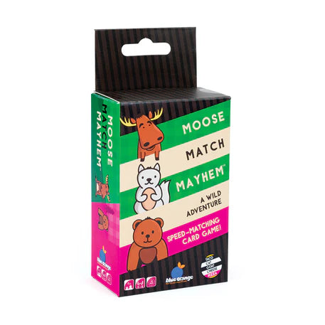 Each player takes a card from the stack. Everyone chants “Moose! Match! Mayhem!” flips their card over and races to grab the best card to make a match. The first player to collect three sets of animals wins!