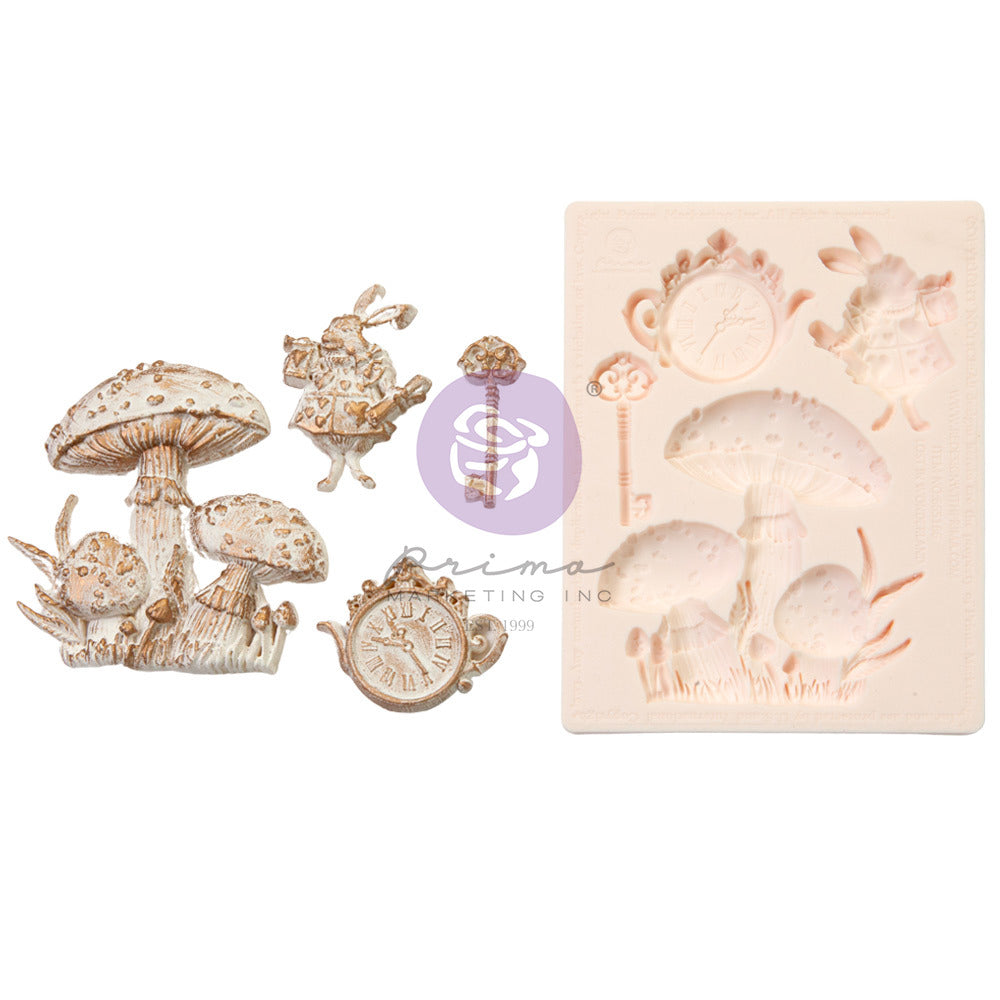1 pc, 3.5"x4.5"x8mm - Create unique and beautiful embellishments with the Lost In Wonderland silicone mould, designed by The 3 Girls Tale. It features whimsical designs including a mushroom, white rabbit, clock, teapot, and key - all of which coordinate beautifully with the Lost in Wonderland collection. The mould measures 3.5" x 4.5". Use resin, modeling clay, hot glue, melting chocolate (yes, the mould is food safe), fondant, and any other medium to cast your own embellishments or edible candies.