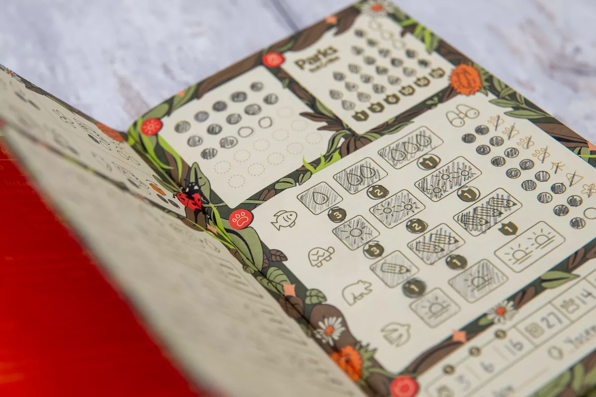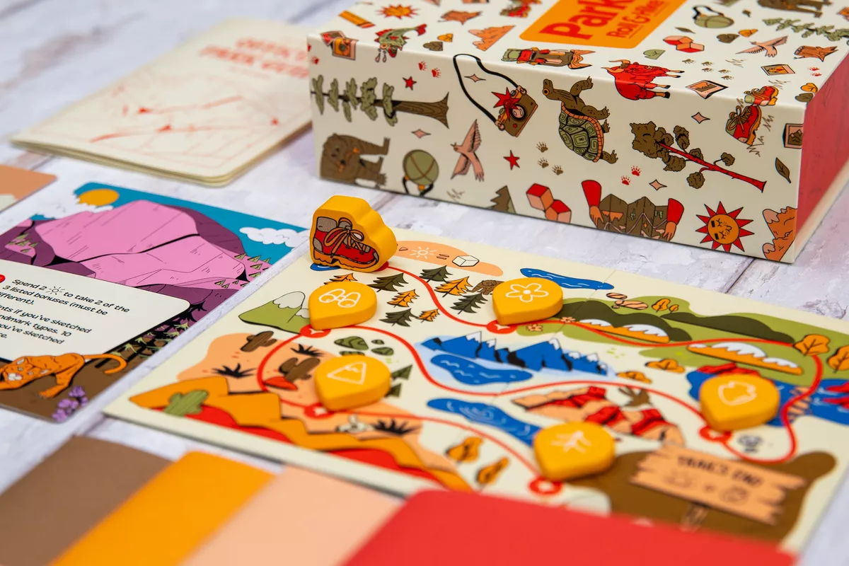 Welcome to Parks: Roll & Hike, the newest, diciest addition to the Parks family! During the game, you draft dice and log your selections in your handy journal. Record your time in the mountains, forests, and fields through drawing. Keep a log of all the wildlife you spot to earn mid-hike bonuses, and don't forget to stay hydrated!