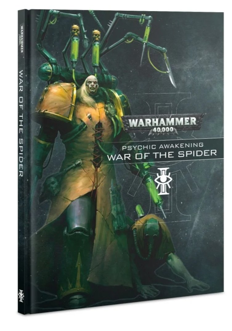 The epic Psychic Awakening series continues with War of the Spider. This campaign book features a host of new rules for Chaos Space Marines, Death Guard, Talons of the Emperor and Officio Assassinorum. It also includes background on the web that Fabius Bile spins around the devastated Cadian system as he is pursued by the Death Guard, Adeptus Custodes, Sisters of Silence and multiple teams of Assassins. Will they catch him, or will he escape to continue his twisted experiments?
