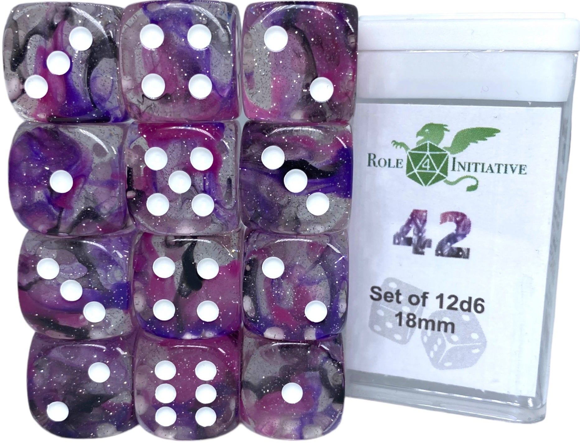 This block of 12d6 in Diffusion 42 includes 18mm pipped dice that are over 40% larger than traditional 16mm dice for a hefty feel and bigger rolls.