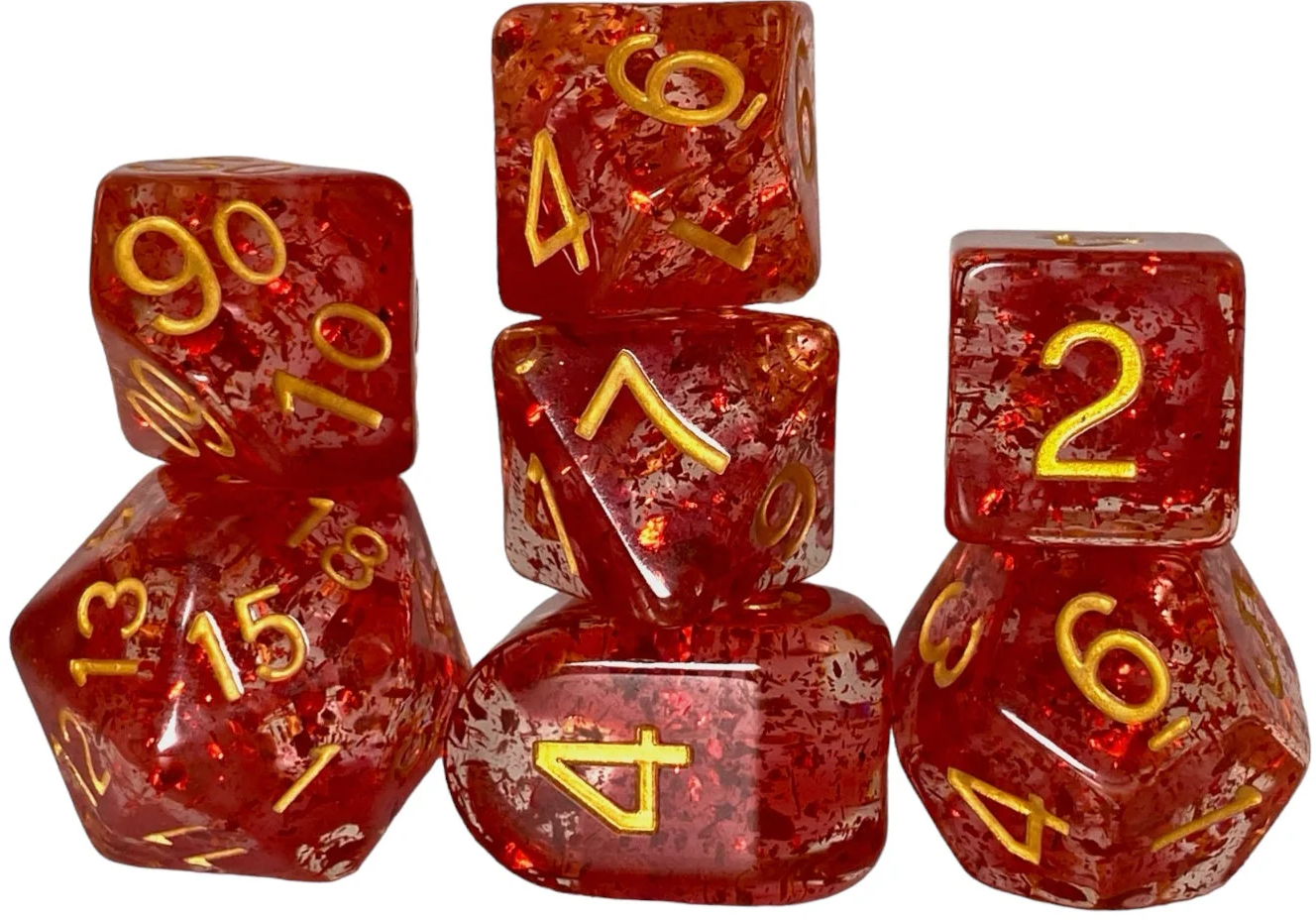 Large high-visibility game dice: Diffusion Alchemist's Stone features diffused Red with red foil flakes and metallic gold numbers. It is hard for photos to do justice to just how beautiful this set is when light catches the foil!