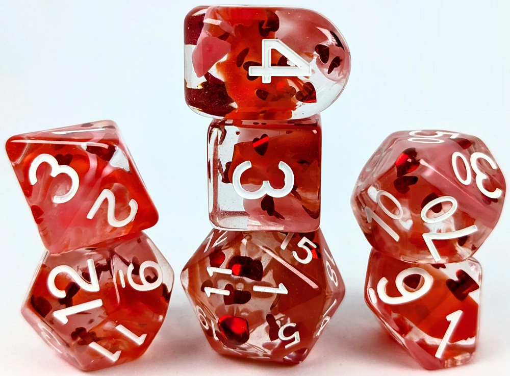 Our latest offering in our Holi-Dice collection: Diffusion Lovestruck is a gorgeous pairing of Diffused pink and red w/ red heart-shaped glitter and white numbers. You'll fall in love at first sight!