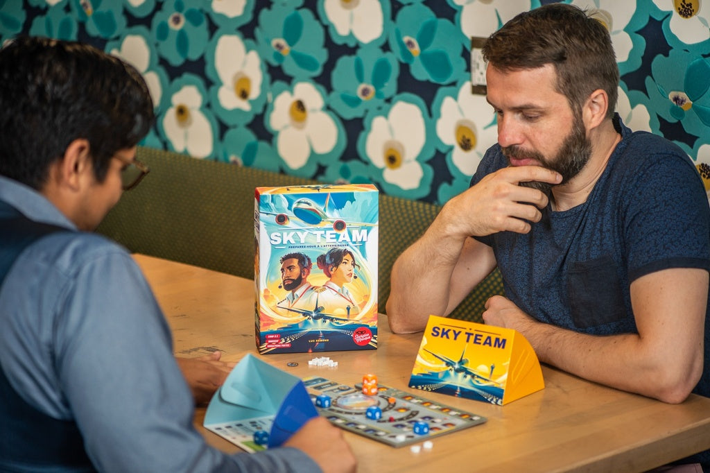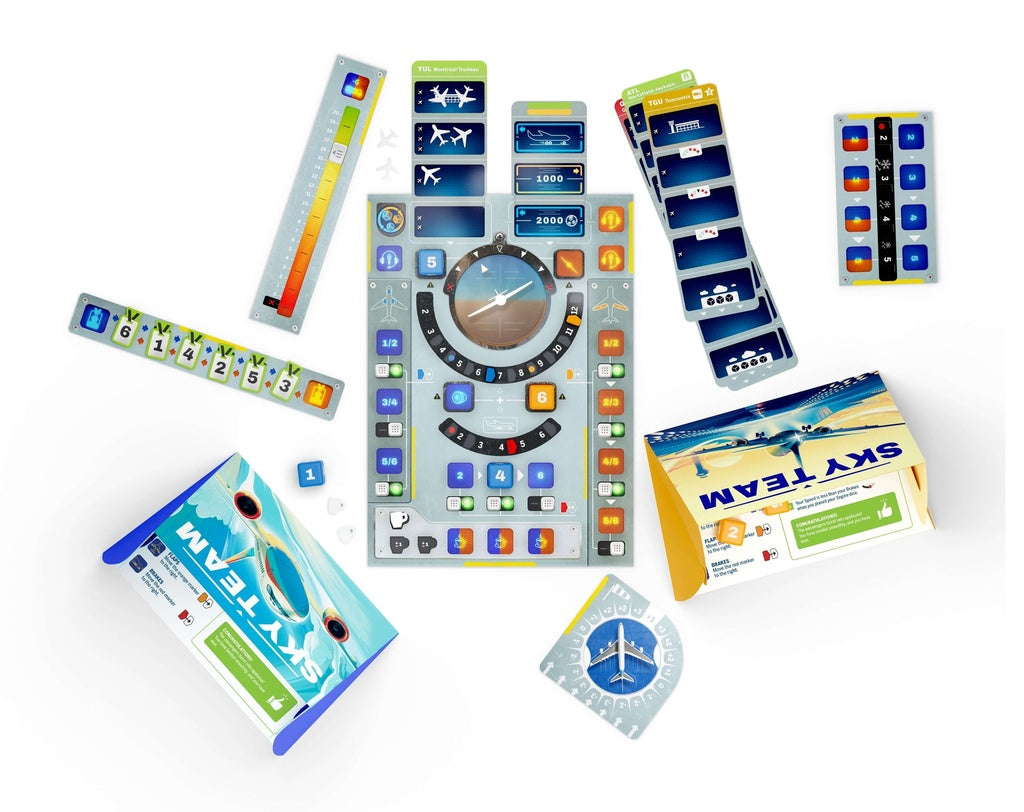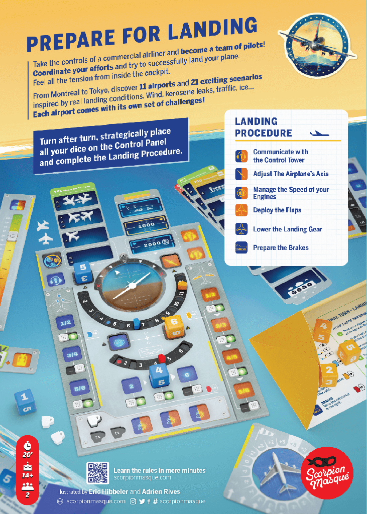 To land your plane, you need to silently assign your dice to the correct spaces in your cockpit to balance the axis of your plane, control its speed, deploy the flaps, extend the landing gear, contact the control tower to clear your path, and even have a little coffee to improve your concentration enough to change the value of your dice.