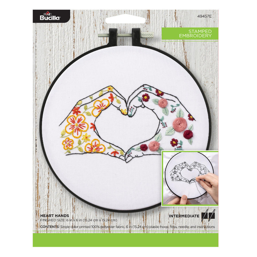 Create something handmade to share love and positivity with the Bucilla Heart Hands Stamped Embroidery Kit. This unique embroidery kit features two floral covered hands that come together to form a heart. This kit includes a stamped embroidery fabric, a 6 inch black round embroidery hoop, 100% cotton embroidery floss, embroidery needle, and instructions. Whether you have been stitching for years or you are looking to learn a new skill, Bucilla provides the products and education for every interest and skill level. Bucilla makes the art of embroidery fun and easy to create something handmade you can be proud of. Take your stitching skills to the next level with the unique design of the Bucilla Heart Hands Stamped Embroidery Kit.