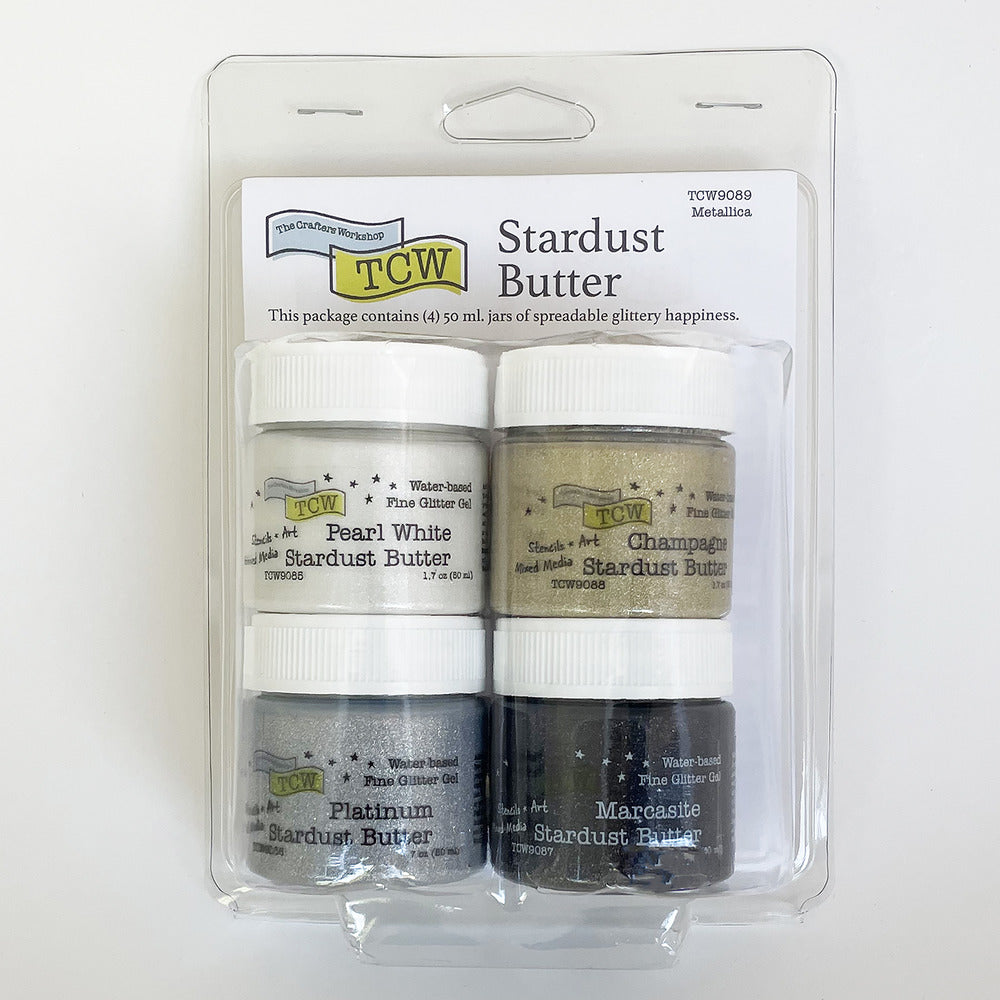 Delicious spreadable Stencil Butter has a shimmer and shine, that spreads easily with a palette knife. It has the body of a soft modeling paste that holds its peaks and valleys for texture and interest and cleans easily with water (be sure to rinse your tools immediately after use). Perfect for spreading through stencils, finger-painting, brush-painting and much more. These colors blend beautifully with each other as well as with all of our Mixed Media Goodies, including our Metallic Pastes! TCW Stencil Butters coordinate beautifully with our ColorSparx Powders. You can even mix the dry powder into the Stencil Butter to create additional unique color tones. Available in easy to use 2 ounce jars. Dries in 15-30 minutes depending on how thickly applied. Great for use on Watercolor Paper, Mixed Media Boards, Canvas, Wood and more.