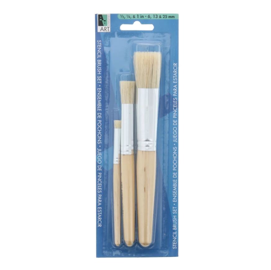 These flat head brushes feature 100% white hog bristles. Made especially for stencil application on walls, furniture, fabric and other surfaces, the natural flags of the bristles allow them to hold generous amounts of color. The bristles are firm and springy, giving a nice bounce to every application, while maintaining the flexibility needed for subtle shading. They are secured to a comfortable, lacquered natural birch handle with a seamless aluminum ferrule. Set of 3 includes a .25", .5" and 1" brush.