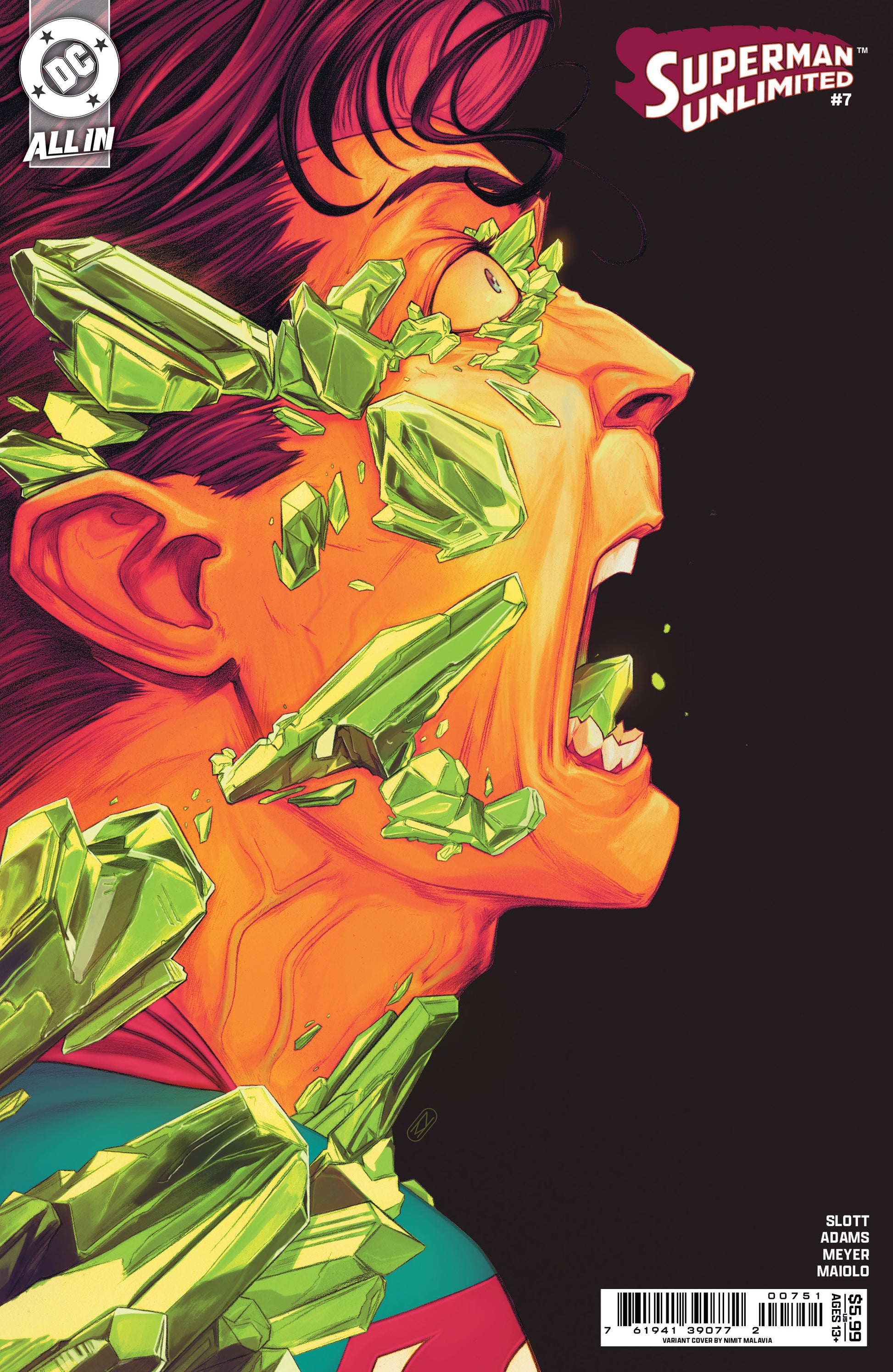 When the towering terror of Toyman once again terrorizes the streets of Metropolis, Superman and Krypto are on hand to save the day—but in this new world of Kryptonite, even the murdering machinations of Toyman are supercharged with Superman’s Achilles’ heel! It’s a twisted turn of events as the Man of Steel uncovers a game-changing new use for this deadly substance, and it has the capacity to…save the world? Plus: Jimmy Olsen moves to Gotham (careful, Jimmy), Tee-Nah of Gorilla City tries to fix Steve Lombard’s laptop (careful, Tee-Nah), and Intergang floods the streets—all in the latest installment of the emerald epic you’ll have to read to believe!