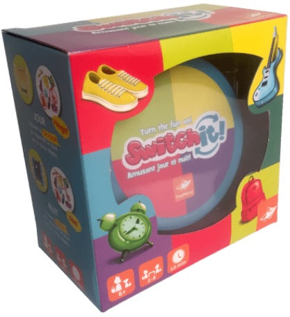 Switch It! is a fast-paced game where players try to be the first to locate objects or colors depending on if it’s nighttime or daytime. It’s nighttime! Act fast to find the OBJECT that appears the most on the card. It’s daytime! Quickly find the COLOR that appears the most on the card. Special situations arise that add a clever twist to the chaos making Switch It! the game of choice for those who like to THINK and ACT fast.