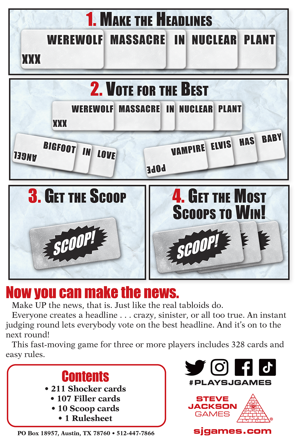 Everyone creates a headline . . . crazy, possibly impossible – or all too true. An instant judging round lets everybody vote on the best headline. And it’s on to the next! The best headline each round gets the “Scoop,” and the player with the most Scoops wins the game!
