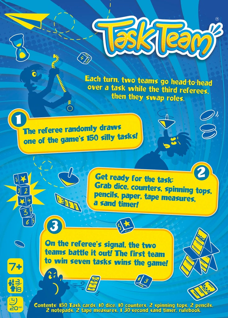 The first team to win seven Task cards is declared the winner.
