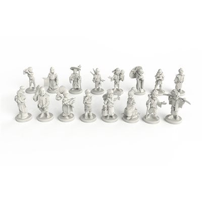 Tokaido: Matsuri Minis is a set of sixteen unpainted miniatures that match the characters introduced in the Tokaido: Matsuri expansion for Tokaido.