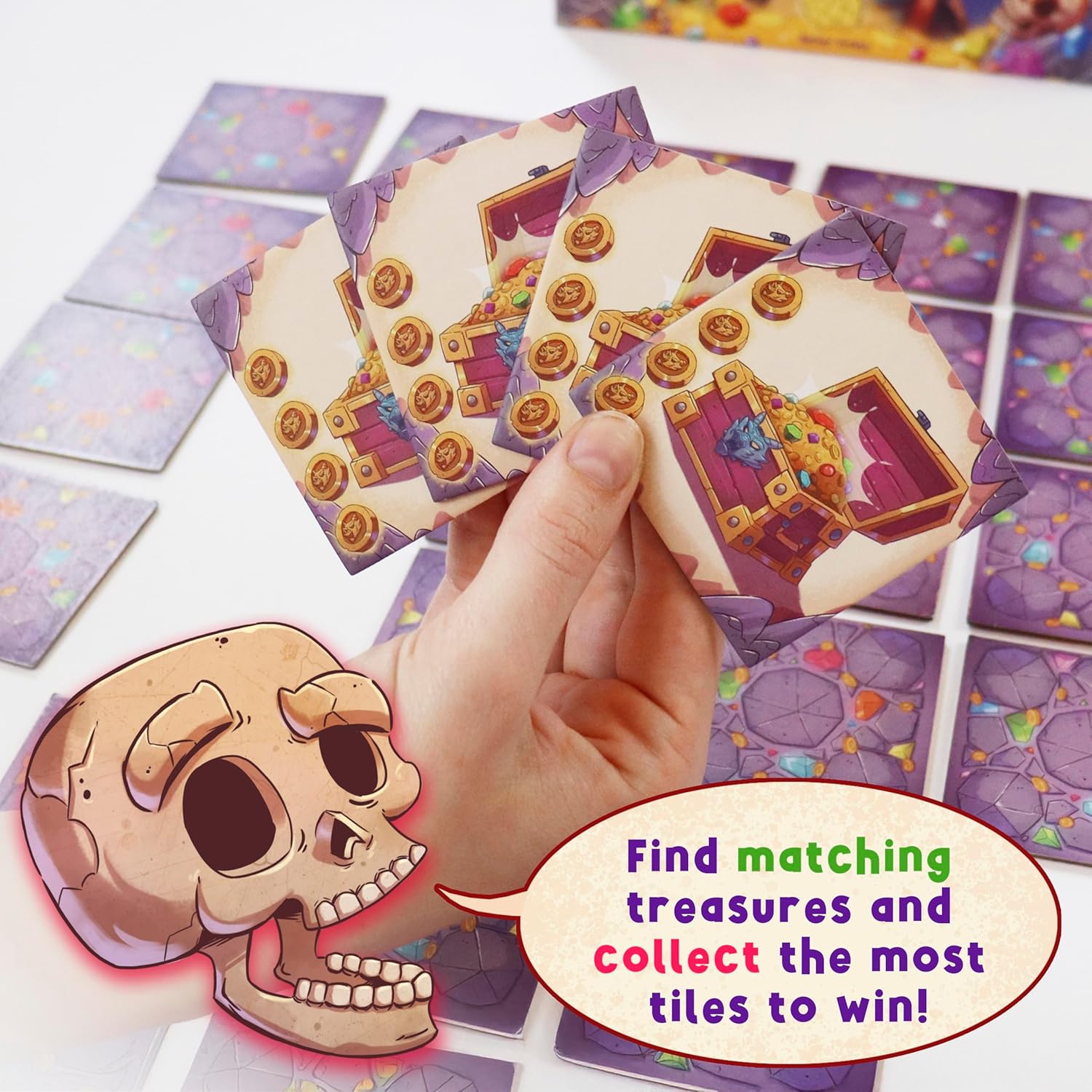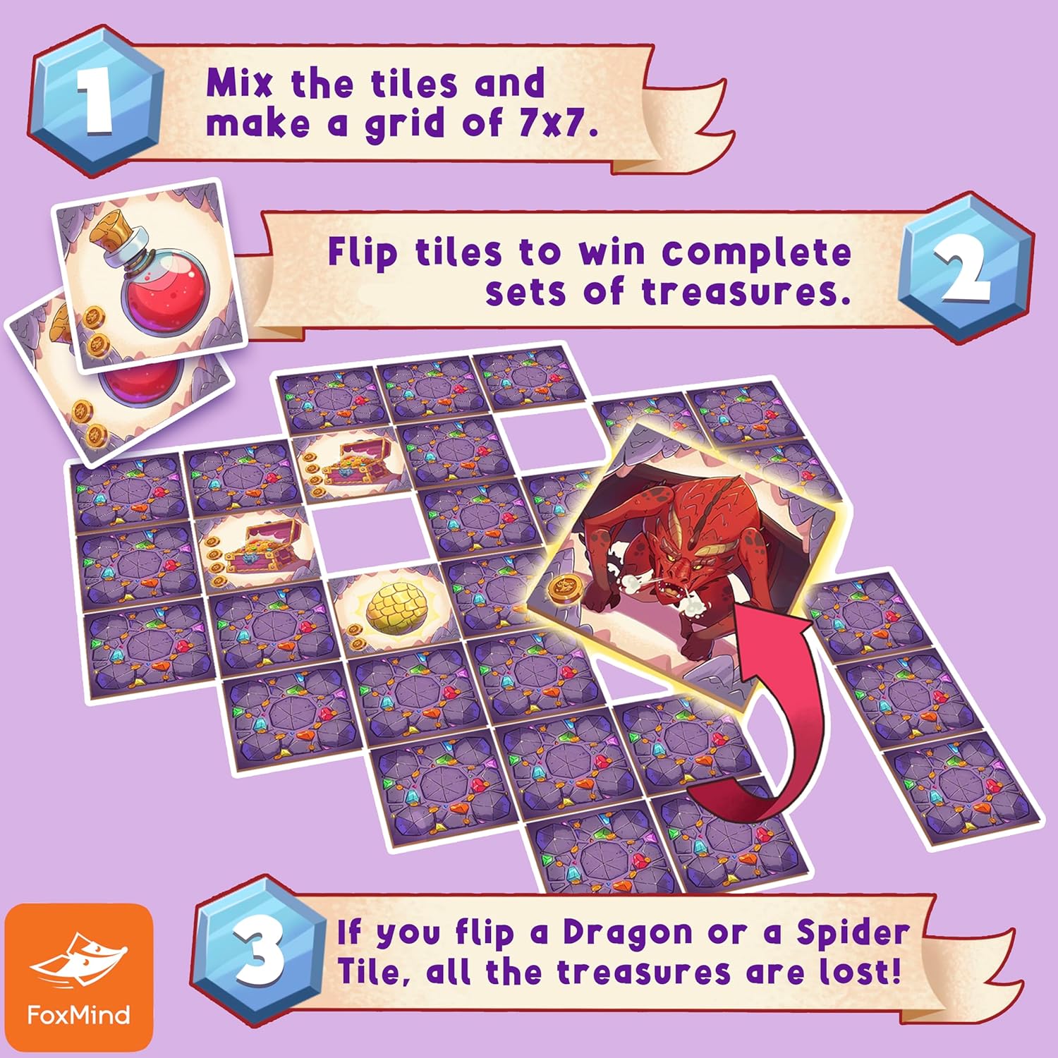 Join the adventure and explore the depths of the dragon's cave to find the most valuable treasures Players will use their memory and push their luck to be the best treasure hunter. Avoid turning spiders and dragons over or all will be lost. This quick and easy-to-play game will appeal to the whole family and is a great learning tool for teachers and parents. A great fun family gift with plastic-free and eco-friendly components.