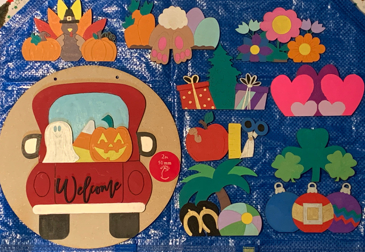 shapes include: back to school, palm tree, Christmas ornaments, clover, Halloween, thanksgiving, easter bunny bum, Christmas tree and presents, flowers, hearts