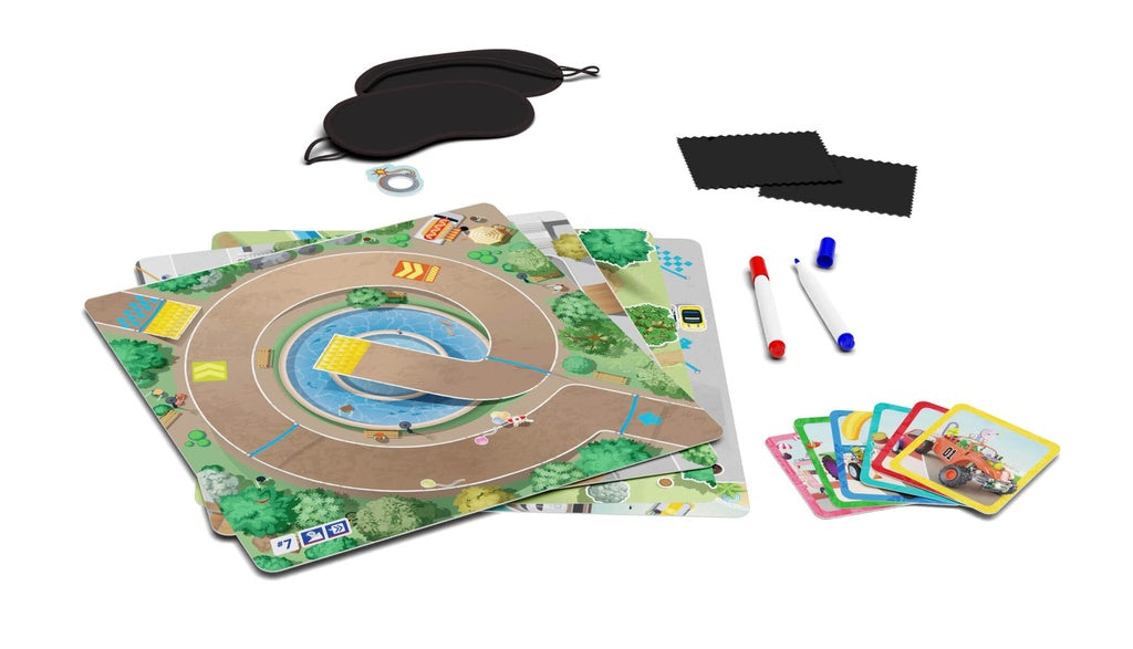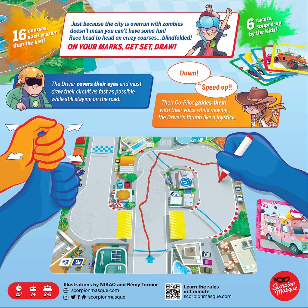 Either co-operatively or competitively, in Turbo Kidz you want to be the first to cross the finish line in a series of hilarious races...blindfolded! For each race, the driver covers their eyes and must draw their circuit as quickly as possible while still staying on the road. Their co-pilot guides them with their voice, while moving the driver's thumb like a joystick to prevent them from going off the road.