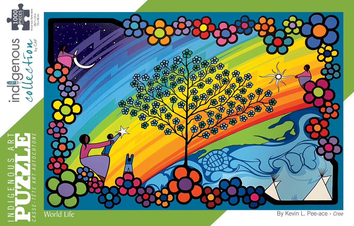 World Life puzzle, by artist Kevin Pee-ace. His cultural background is Cree. The artist is paid a royalty on every sale.